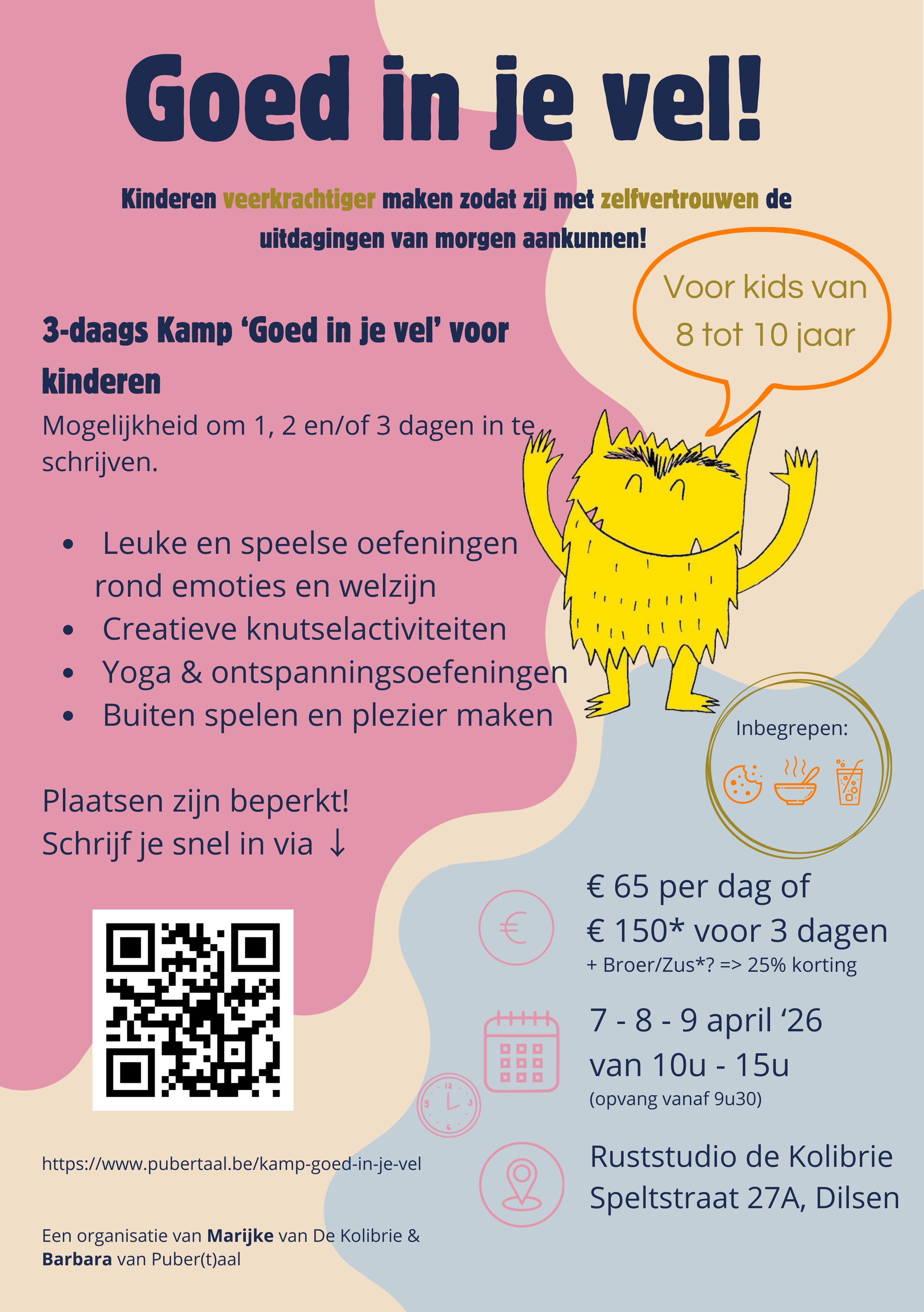 Wil jij dat jouw kind op een speelse en ontspannen manier leert omgaan met emoties en meer zelfvertrouwen krijgt? Dan is het "Goed in je vel"-kamp de perfecte ervaring! Tijdens dit driedaagse kamp bieden we een mix van speelse oefeningen, creatieve activiteiten en ontspanning, allemaal gericht op het welzijn van je kind.
